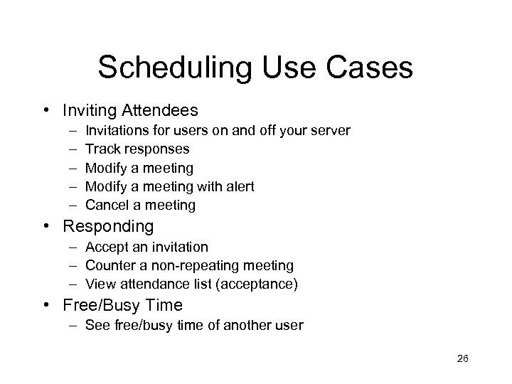 Scheduling Use Cases • Inviting Attendees – – – Invitations for users on and off your server Track responses Modify a meeting with alert Cancel a meeting • Responding – Accept an invitation – Counter a non-repeating meeting – View attendance list (acceptance) • Free/Busy Time – See free/busy time of another user 26