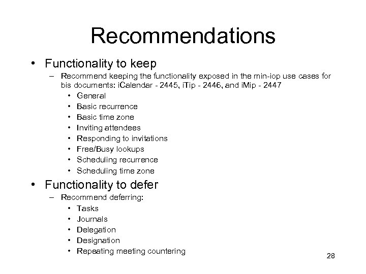 Recommendations • Functionality to keep – Recommend keeping the functionality exposed in the min-iop use cases for bis documents: i. Calendar - 2445, i. Tip - 2446, and i. Mip - 2447 • General • Basic recurrence • Basic time zone • Inviting attendees • Responding to invitations • Free/Busy lookups • Scheduling recurrence • Scheduling time zone • Functionality to defer – Recommend deferring: • Tasks • Journals • Delegation • Designation • Repeating meeting countering 28