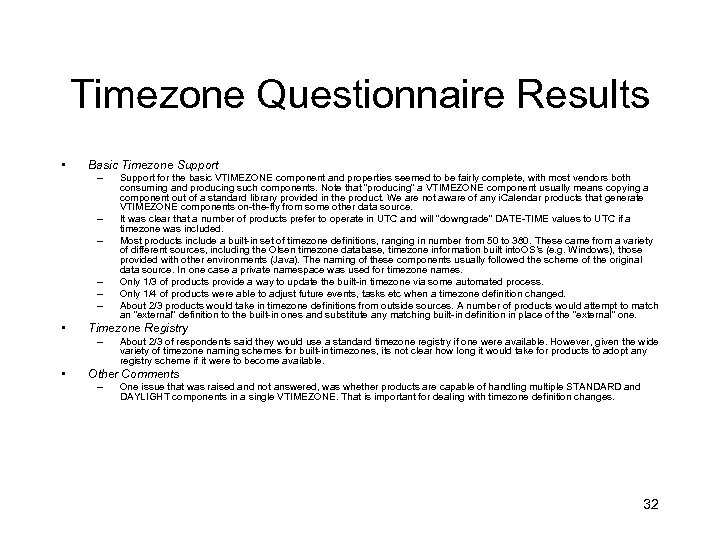 Timezone Questionnaire Results • Basic Timezone Support – – – • Timezone Registry – • Support for the basic VTIMEZONE component and properties seemed to be fairly complete, with most vendors both consuming and producing such components. Note that “producing” a VTIMEZONE component usually means copying a component out of a standard library provided in the product. We are not aware of any i. Calendar products that generate VTIMEZONE components on-the-fly from some other data source. It was clear that a number of products prefer to operate in UTC and will “downgrade” DATE-TIME values to UTC if a timezone was included. Most products include a built-in set of timezone definitions, ranging in number from 50 to 380. These came from a variety of different sources, including the Olsen timezone database, timezone information built into S’s (e. g. Windows), those O provided with other environments (Java). The naming of these components usually followed the scheme of the original data source. In one case a private namespace was used for timezone names. Only 1/3 of products provide a way to update the built-in timezone via some automated process. Only 1/4 of products were able to adjust future events, tasks etc when a timezone definition changed. About 2/3 products would take in timezone definitions from outside sources. A number of products would attempt to match an “external” definition to the built-in ones and substitute any matching built-in definition in place of the “external” one. About 2/3 of respondents said they would use a standard timezone registry if one were available. However, given the wide variety of timezone naming schemes for built-in timezones, its not clear how long it would take for products to adopt any registry scheme if it were to become available. Other Comments – One issue that was raised and not answered, was whether products are capable of handling multiple STANDARD and DAYLIGHT components in a single VTIMEZONE. That is important for dealing with timezone definition changes. 32