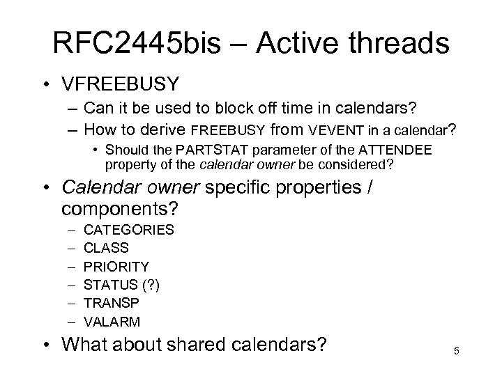 RFC 2445 bis – Status Update • Submitted draft – 00 – http: //www. ietf. org/internet-drafts/draft-ietf-calsify-rfc 2445 bis-00. txt • Setup rfc 2445 bis Issues List – http: //ietf. webdav. org/calsify/rfc 2445 bis-issues. html • Collected list of issues with rfc 2445 – http: //ietf. webdav. org/calsify/rfc 2445 bis/rfc 2445 -issues. txt 4