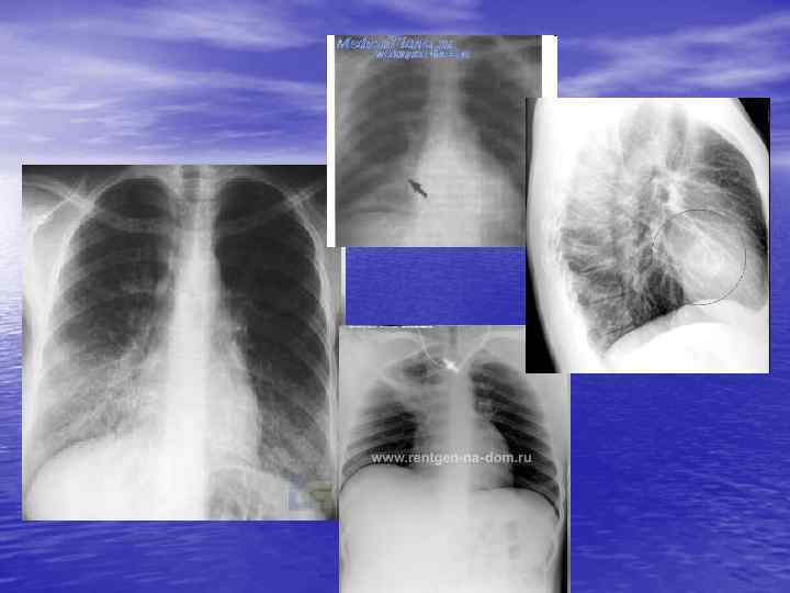 Синдром утворення порожнини в легені • Під час перкусії визначається притуплено – тимпанічний звук. При аускультації виявляються вологі хрипи, амфоричне дихання. Лабораторне дослідження дає можливість виявити лейкоцитоз, прискорення ШОЕ. Рентгенівські зміни проявляються синдромом круглої тіні або синдромом утворення порожнини.