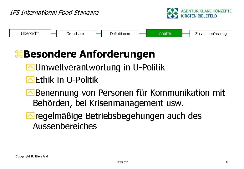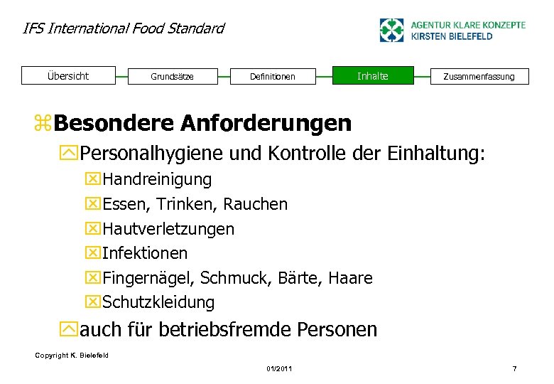 IFS International Food Standard Übersicht Grundsätze Definitionen Inhalte Zusammenfassung z. Besondere Anforderungen y. Umweltverantwortung in U-Politik y. Ethik in U-Politik y. Benennung von Personen für Kommunikation mit Behörden, bei Krisenmanagement usw. yregelmäßige Betriebsbegehungen auch des Aussenbereiches Copyright K. Bielefeld 01/2011 6