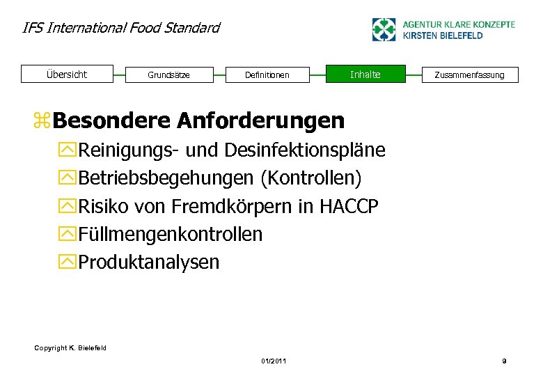 IFS International Food Standard Übersicht Grundsätze Definitionen Inhalte Zusammenfassung z. Besondere Anforderungen y. Reklamationen und Beanstandungen y. Produktsperrung und –freigabe y. Rückruf, Rücknahme y. Frühwarnsystem y. Korrekturmaßnahmen Copyright K. Bielefeld 01/2011 10