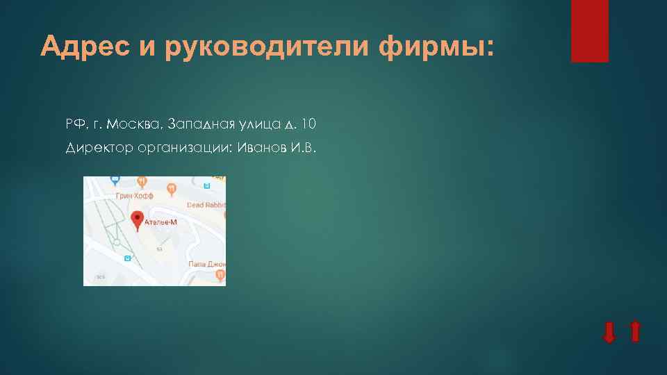 Адрес и руководители фирмы: РФ, г. Москва, Западная улица д. 10 Директор организации: Иванов И. В.
