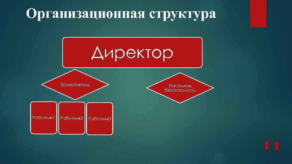 Организационная структура Директор Заместитель Работник 1 Работник 2 Работник 3 Начальник безопасности