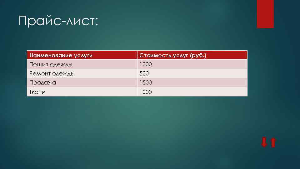 Прайс-лист: Наименование услуги Стоимость услуг (руб. ) Пошив одежды 1000 Ремонт одежды 500 Продажа 1500 Ткани 1000