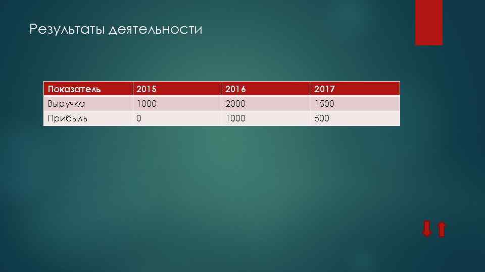 Результаты деятельности Показатель 2015 2016 2017 Выручка 1000 2000 1500 Прибыль 0 1000 500