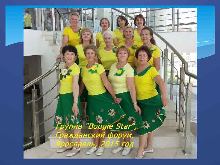 Мы танцуем буги-вуги В 2012 году был создан клуб «Долголетие» , объединивший активных творческих людей. Девиз нашего коллектива «Кто танцует буги-вуги, не берут того недуги» . Тренировки и постановку танцев проводит Игорь Кузнецов - Президент Молодежного движения «Буги -вуги Ярославль» От каждого занятия, каждого выступления МЫ получаем огромное удовольствие.