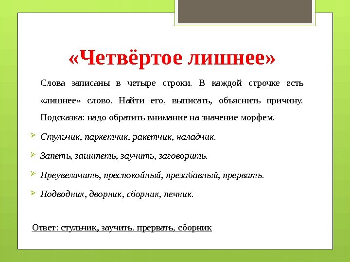 «Четвёртое лишнее» Слова записаны в четыре строки. В каждой строчке есть «лишнее» слово. Найти его, выписать, объяснить причину. Подсказка: надо обратить внимание на значение морфем. Стульчик, паркетчик, ракетчик, наладчик. Запеть, зашипеть, заучить, заговорить. Преувеличить, преспокойный, презабавный, прервать. Подводник, дворник, сборник, печник. Ответ: стульчик, заучить, прервать, сборник