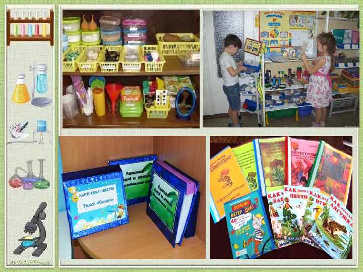 СТАРШИЙ ДОШКОЛЬНЫЙ ВОЗРАСТ - СХЕМЫ, ТАБЛИЦЫ, МОДЕЛИ С АЛГОРИТМАМИ ВЫПОЛНЕНИЯ ОПЫТОВ; - СЕРИИ КАРТИН С ИЗОБРАЖЕНИЕМ ПРИРОДНЫХ СООБЩЕСТВ; - КНИГИ ПОЗНАВАТЕЛЬНОГО ХАРАКТЕРА, АТЛАСЫ; - ТЕМАТИЧЕСКИЕ АЛЬБОМЫ; - КОЛЛЕКЦИИ - МИНИ-МУЗЕЙ (ТЕМАТИКА РАЗЛИЧНА, НАПРИМЕР "ЧАСЫ БЫВАЮТ РАЗНЫЕ: ", "ИЗДЕЛИЯ ИЗ КАМНЯ". - СИТО, ВОРОНКИ - ПОЛОВИНКИ МЫЛЬНИЦ, ФОРМЫ ДЛЯ ЛЬДА ; - КЛЕЕНЧАТЫЕ ФАРТУКИ, НАРУКАВНИКИ, РЕЗИНОВЫЕ ПЕРЧАТКИ, ТРЯПКИ ; - МИНИ-СТЕНД "О ЧЕМ ХОЧУ УЗНАТЬ ЗАВТРА"; - ЛИЧНЫЕ БЛОКНОТЫ ДЕТЕЙ ДЛЯ ФИКСАЦИИ РЕЗУЛЬТАТОВ ОПЫТОВ; - КАРТОЧКИ-ПОДСКАЗКИ (РАЗРЕШАЮЩИЕ - ЗАПРЕЩАЮЩИЕ ЗНАКИ) "ЧТО МОЖНО, ЧТО НЕЛЬЗЯ" ; - ПЕРСОНАЖИ, НАДЕЛЁННЫЕ ОПРЕДЕЛЕННЫМИ ЧЕРТАМИ - ("НЕЗНАЙКА") ОТ ИМЕНИ КОТОРОГО МОДЕЛИРУЕТСЯ ПРОБЛЕМНАЯ СИТУАЦИЯ.