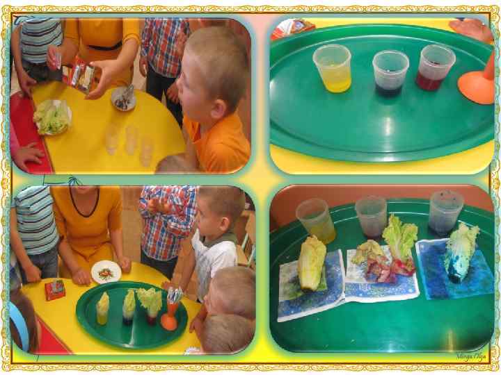 «Растения пьют воду» 1. Берем 2 стакана, наливаем в них воду, ставим веточки комнатного растения. 2. В воду одного из стаканов добавляем краситель красного цвета. 3. Через некоторое время: в этом стакане листья и стебель приобретут красный оттенок: растение пьет воду. «Как получить белый цвет или волшебный волчок» 1. Берем волчок (или делим круг на три равные сектора и раскрашиваем в три цвета: синий, зеленый, красный). 2. Раскручиваем волчок на поверхности стола. Если рисовали на круге, то в центр круга вставить тонко заточенный карандаш, который будет выполнять роль оси волчка. 3. Волчок крутится, визуально поверхность его становится белой: цвет не видно.