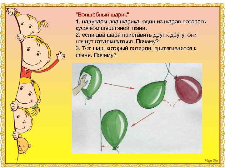 "Волшебный шарик" 1. надуваем два шарика, один из шаров потереть кусочком шерстяной ткани. 2. если два шара приставить друг к другу, они начнут отталкиваться. Почему? 3. Тот шар, который потерли, притягивается к стене. Почему?
