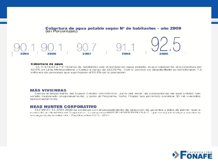 Redefinir Planes Estratégico de las empresas bajo el ámbito de FONAFE debe definir los lineamientos corporativos en la formulación de los planes estratégicos (P. E. ) de sus empresas, por ello estableció una estructura homogénea para su presentación. De las 31 empresas que cuentan con un proceso de planeamiento estratégico (INMISA e INDAER no han sido consideradas), 04 han solicitado ampliación para la presentación de sus P. E. (ENAPU, SIMAPERU, SIMA-IQUITOS y FAME), debido a la falta de conformidad por parte del sector. Del análisis realizado se establecieron 04 indicadores corporativos transversales con los que se busca una mayor eficiencia en las empresas del Estado: a) Rentabilidad patrimonial – ROE; b) Grado de cumplimiento de la directiva de transparencia; c) Implementación del Sistema de Control Interno – COSO y d) Implementación del Código de Buen Gobierno Corporativo – CBGC.