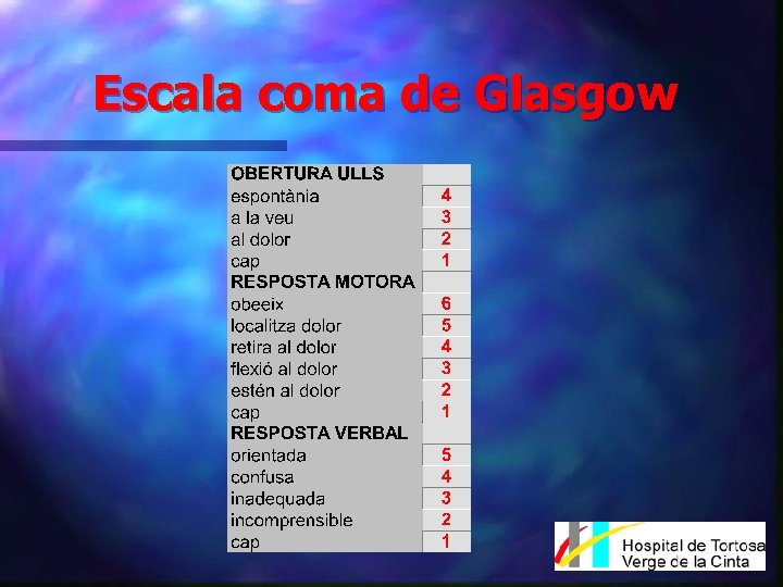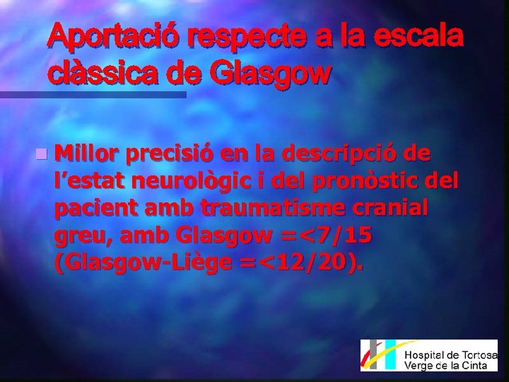 Aportació respecte a la escala clàssica de Glasgow n Millor precisió en la descripció de l’estat neurològic i del pronòstic del pacient amb traumatisme cranial greu, amb Glasgow =<7/15 (Glasgow-Liège =<12/20).