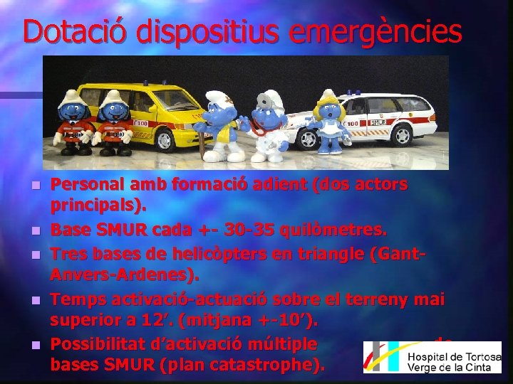 Dotació dispositius emergències n n n Personal amb formació adient (dos actors principals). Base SMUR cada +- 30 -35 quilòmetres. Tres bases de helicòpters en triangle (Gant. Anvers-Ardenes). Temps activació-actuació sobre el terreny mai superior a 12’. (mitjana +-10’). Possibilitat d’activació múltiple de bases SMUR (plan catastrophe).