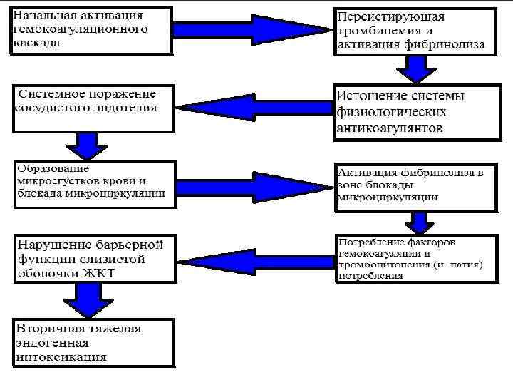 СТАДИИ ДВС-СИНДРОМА. • С нашей точки зрения, наиболее удобной для практики является классификация, встречающаяся в работах 3. С. Баркагана: • Стадия I — гиперкоагуляция и агрегация тромбоцитов; • Стадия II — переходная с нарастающей коагулопатией и тромбоцитопенией, разнонаправленными сдвигами в общих коагуляционных тестах; • Стадия III — глубокой гипокоагуляции (вплоть до полной несвертываемости крови); • IV стадия — восстановительная (или при небла гоприятном течении фаза исходов и осложнений). • Руководство по интенсивной терапии: [Пособие] / А. В. Беляев, Р 85 М. В. Бондарь, А. М. Дубов и др. ; Под ред. А. И. Трещинского, Ф. С. Глумчера. — К. : Вища шк. , 2004. — 382 384 с. : ил.