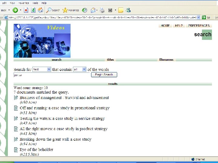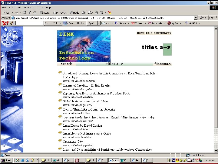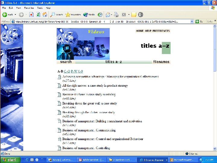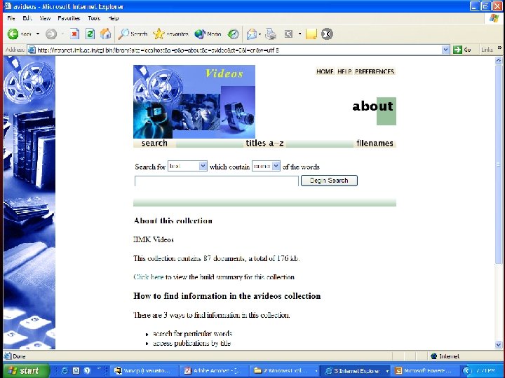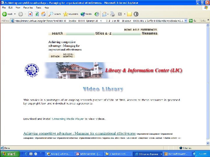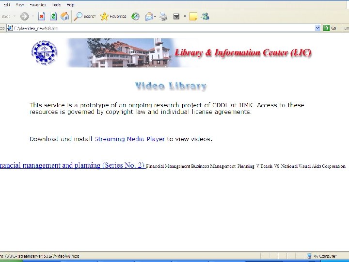 A Videos Digital Library • Collection Strategy • Collection/Service Features using traditional systems • IIMK Library decides its videos go digital • Over 300 Educational • Copyright permissions Videos from publishers • VCR/TV based Viewing • Fully based on Open Source Softwares • Limited Services • As a Bibliography • Limited Access Collection • Balance the Server Load (above 20 GB)