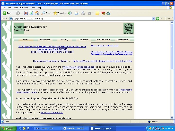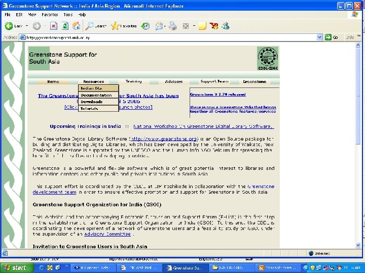 Greenstone Features contd. . . • • • Easy Installation Easy Maintenance Content Development (3 alternate ways) Predominantly GLI now - since (V. 2. 41) Hierarchy Structure Interface Customization – Front Page Design, Header for the Digital Library, Collection Icon, Cover Images Collection Configuration (Collect. cfg) File Scalability, Flexibility Interoperability (Crosswalk), OAI Compliance Lifeline : Listserv / E-Group / Archives