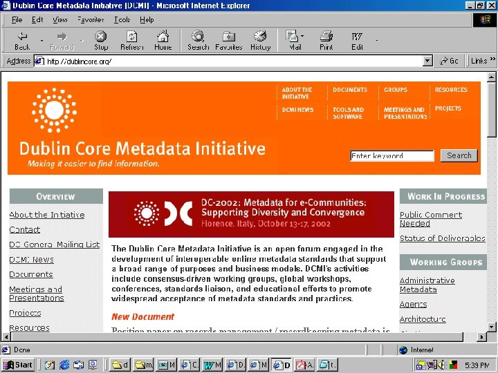 Metadata General Definition • Metadata in its broadest sense is data about data • Documentation about documents and objects • Describing (Tagging) the contents (Resource Description) of the object • For Information Discovery from the Resource Base Internet context • Data describing the attributes of an electronic resource on the net • Dublin Core (DCMI) – WWW Consortium Standard • METS, MODS, EAD, TEI… • XML - The tool