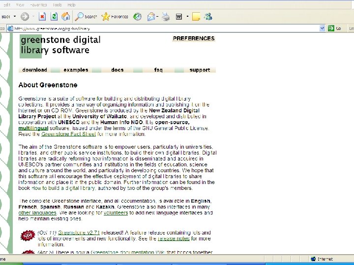 The power of open source: Greenstone uses … v Ghostscript Interpreter for Adobe Postscript documents (Postscript plugin) v Kea Keyphrase extraction program (to generate metadata) v pdftohtml Converter for PDF documents (PDF plugin) v rtftohtml Converter for RTF documents (RTF plugin) v Text. Cat Detects languages and document encodings v wv. Ware Converter for Word documents (Word plugin) v Xlhtml Converter for Excel/Powerpoint documents (plugins) v XML: : Parser Parses XML documents, used to read and write Greenstone’s internal XML document format