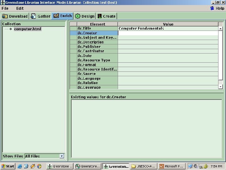 The Greenstone Librarian Interface (GLI) v Building collections v Interactive Java program v Runs on anything v Build a collection on the computer you are on v … plus new applet version v Includes metadata editor v Caveat: cannot deal with such huge collections as Greenstone can (particularly of metadata) • Invoke GLI: build a small collection of HTML files • Gather • Create • Look at extracted metadata • Set up shortcut in the Librarian interface