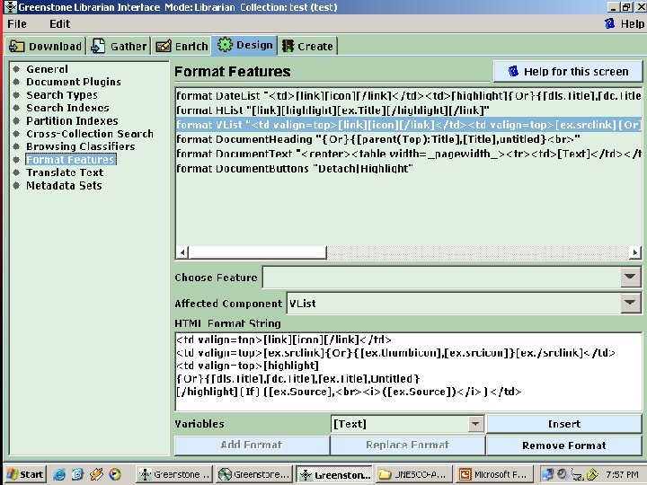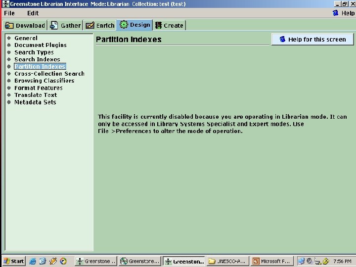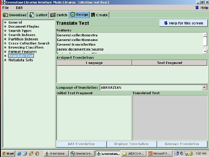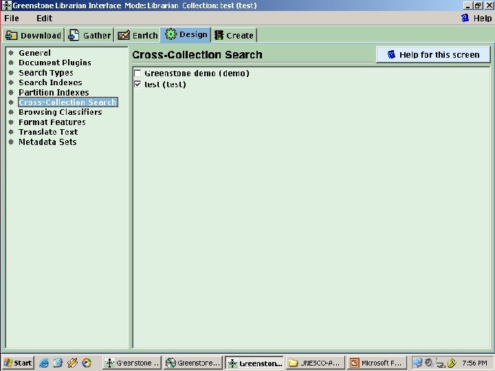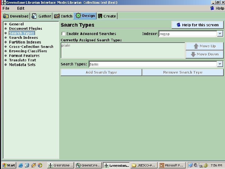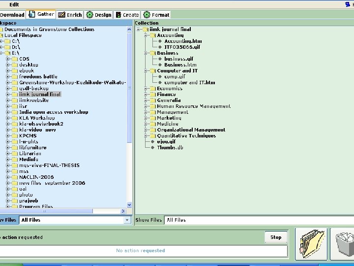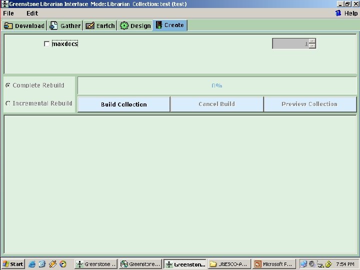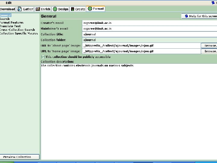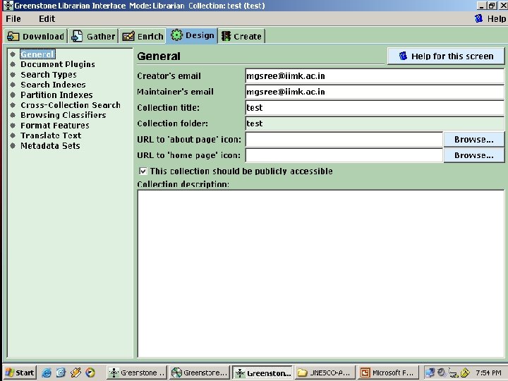 Collection Building… • Greenstone used to have three modes of collection building, viz. , Command Line, Web Interface and the GLI (Greenstone Librarian Interface) • Progressing with version 2. 4 x. , the GLI got strengthened as well as popularized • Web Interface mode has been withdrawn temporarily. • The GLI based collection building is quite easy and simple a method. • Collection developers can activate the GLI software and use the ‘Gather’, ‘Enrich’, ‘Design’, and ‘Create’ panel for making collection
