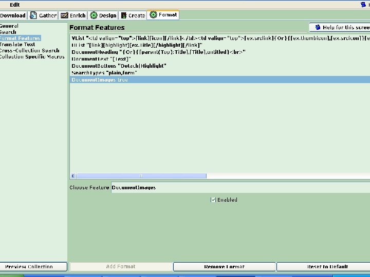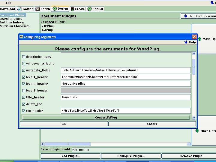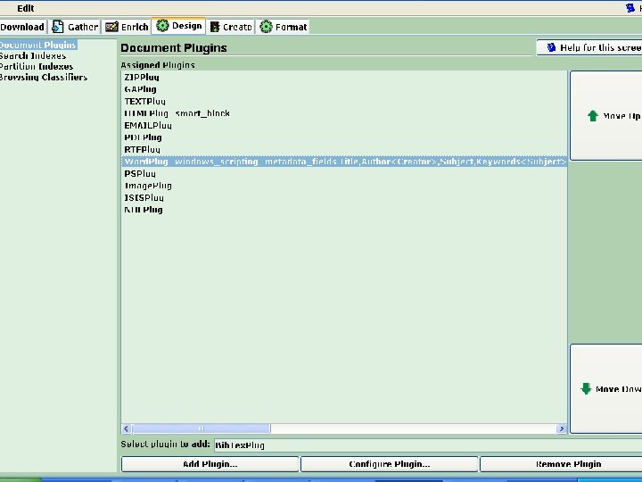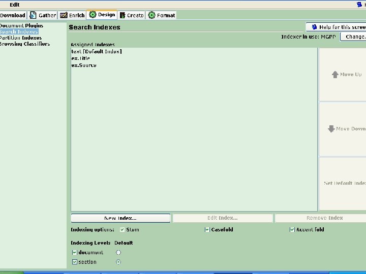 Collection configuration • Collection configuration file determines content conversion, extraction and building of indexes and browsing structures – indexes, classifiers, plugins • Presentation of search/browse results and collection interface is determined by “format” strings and “macros”