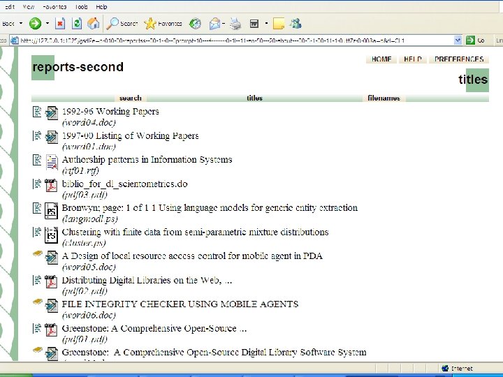 Greenstone DL Software Access üAccessible via any Web browser üServer runs on Windows and Unix üCollections can be published on CD-ROM Searching/ üFull-text and fielded search browsing üFlexible browsing facilities üMetadata-based (Dublin Core) üCollection-specific üHierarchical phrase browsing supported üCreates all access structures automatically Extensible üPlugins — new document, metadata formats üClassifiers — new metadata browsers Multilingual üDocuments and interfaces üChinese, Arabic, Maori, Russian etc (+ European) üMultimedia: video, audio collections exist