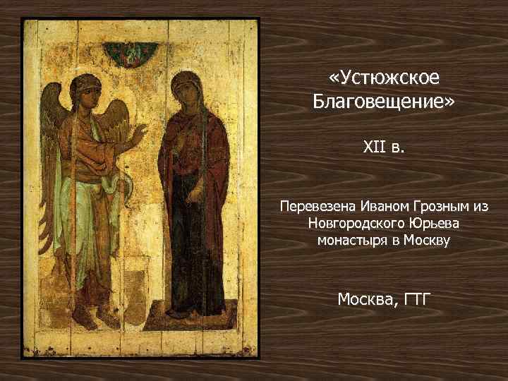 «Устюжское Благовещение» XII в. Перевезена Иваном Грозным из Новгородского Юрьева монастыря в Москву Москва, ГТГ