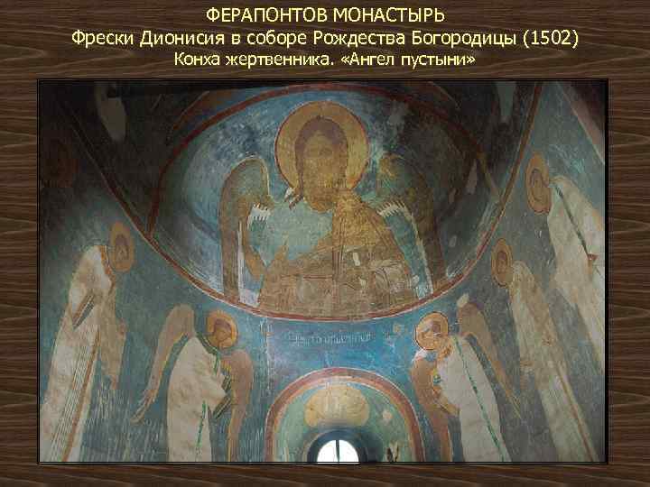ФЕРАПОНТОВ МОНАСТЫРЬ Фрески Дионисия в соборе Рождества Богородицы (1502) Конха жертвенника. «Ангел пустыни»
