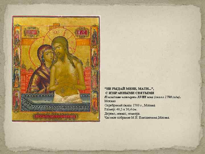 "НЕ РЫДАЙ МЕНЕ, МАТИ. . . ", С ИЗБРАННЫМИ СВЯТЫМИ Последняя четверть XVIII века (около 1780 года). Москва Серебряный оклад 1780 г. , Москва Размер: 40, 5 х 30, 4 см. Дерево, левкас, темпера. Частное собрание М. Е. Елизаветина, Москва.