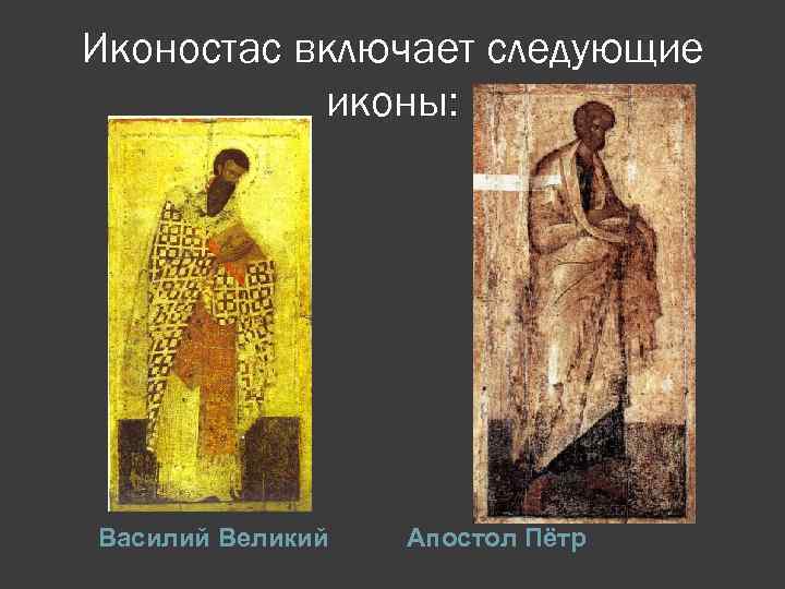 Иконостас включает следующие иконы: Василий Великий Апостол Пётр