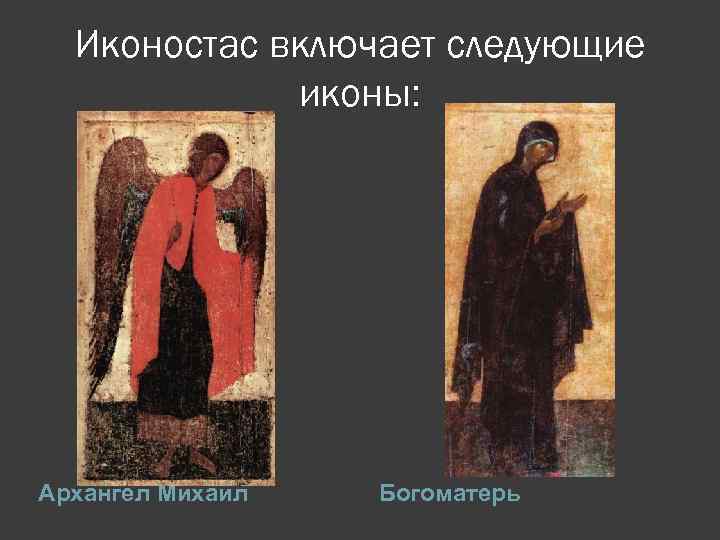 Иконостас включает следующие иконы: Архангел Михаил Богоматерь