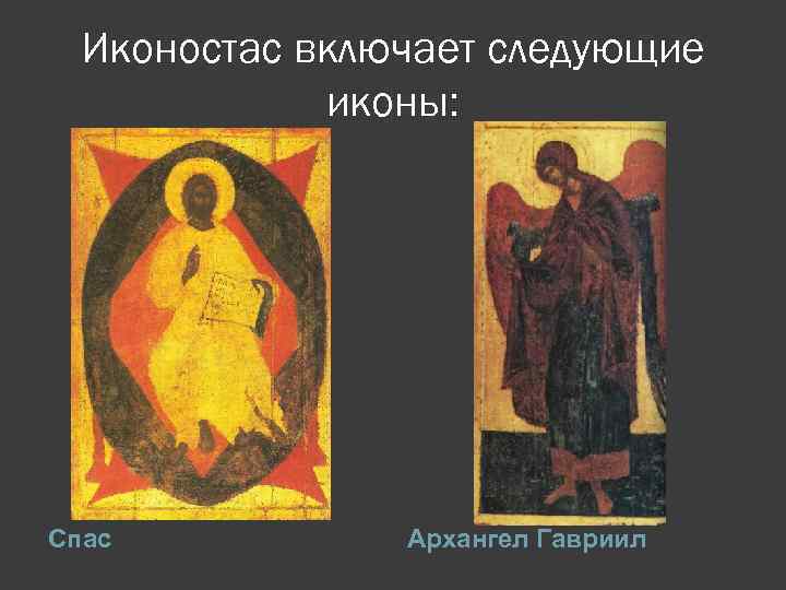 Иконостас включает следующие иконы: Спас Архангел Гавриил