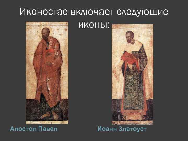 Иконостас включает следующие иконы: Апостол Павел Иоанн Златоуст