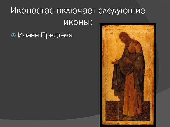 Иконостас включает следующие иконы: Иоанн Предтеча