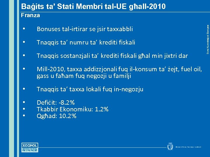 Baġits ta’ Stati Membri tal-UE għall-2010 • Bonuses tal-irtirar se jsir taxxabbli • Tnaqqis ta’ numru ta’ krediti fiskali • Tnaqqis sostanzjali ta’ krediti fiskali għal min jixtri dar • Mill-2010, taxxa addizzjonali fuq il-konsum ta’ żejt, fuel oil, gass u faħam fuq negozji u familji • Tnaqqis ta’ taxxa lokali fuq in-negozju • • • Defiċit: -8. 2% Tkabbir Ekonomiku: 1. 2% Qgħad: 10. 2% Sors: Kummissjoni Ewropea Franza