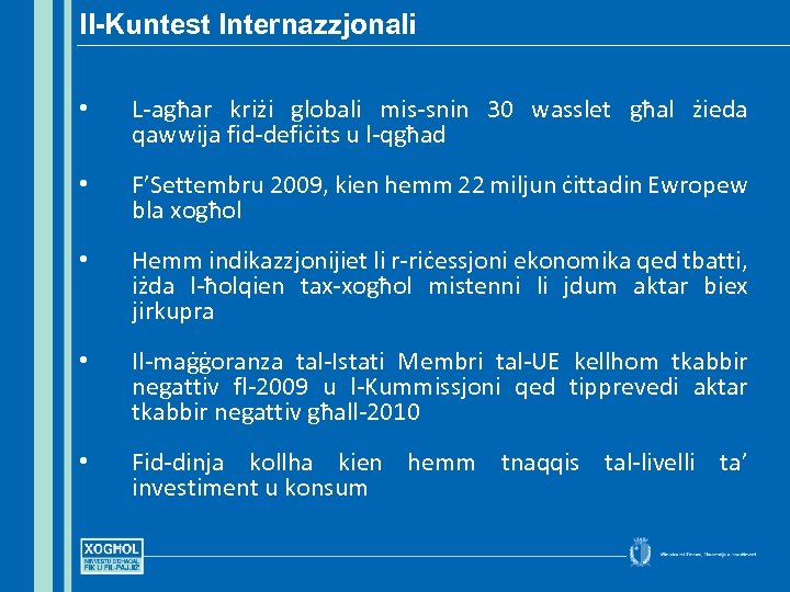 Il-Kuntest Internazzjonali • L-agħar kriżi globali mis-snin 30 wasslet għal żieda qawwija fid-defiċits u l-qgħad • F’Settembru 2009, kien hemm 22 miljun ċittadin Ewropew bla xogħol • Hemm indikazzjonijiet li r-riċessjoni ekonomika qed tbatti, iżda l-ħolqien tax-xogħol mistenni li jdum aktar biex jirkupra • Il-maġġoranza tal-Istati Membri tal-UE kellhom tkabbir negattiv fl-2009 u l-Kummissjoni qed tipprevedi aktar tkabbir negattiv għall-2010 • Fid-dinja kollha kien hemm tnaqqis tal-livelli ta’ investiment u konsum