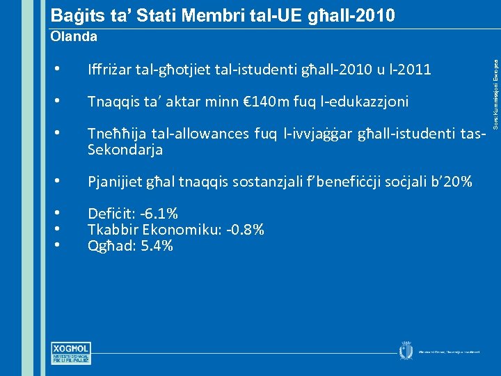 Baġits ta’ Stati Membri tal-UE għall-2010 • Iffriżar tal-għotjiet tal-istudenti għall-2010 u l-2011 • Tnaqqis ta’ aktar minn € 140 m fuq l-edukazzjoni • Tneħħija tal-allowances fuq l-ivvjaġġar għall-istudenti tas. Sekondarja • Pjanijiet għal tnaqqis sostanzjali f’benefiċċji soċjali b’ 20% • • • Defiċit: -6. 1% Tkabbir Ekonomiku: -0. 8% Qgħad: 5. 4% Sors: Kummissjoni Ewropea Olanda