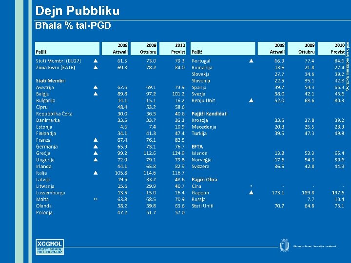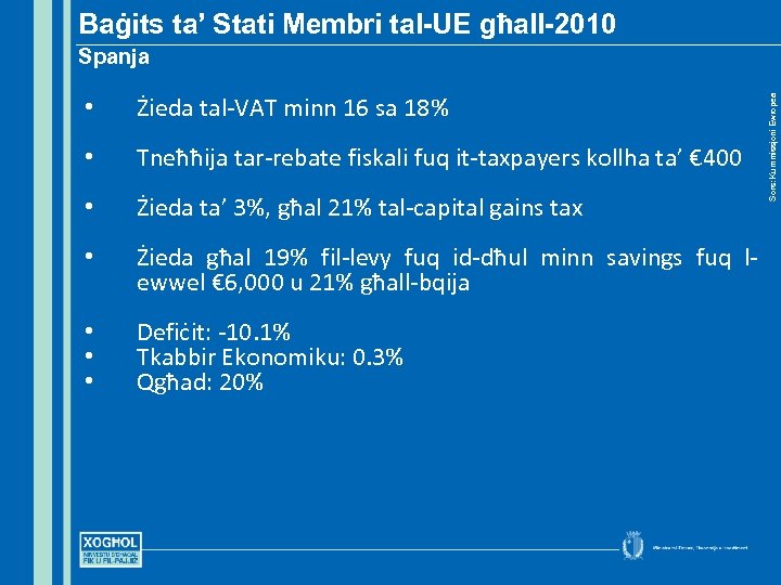 Baġits ta’ Stati Membri tal-UE għall-2010 • Żieda tal-VAT minn 16 sa 18% • Tneħħija tar-rebate fiskali fuq it-taxpayers kollha ta’ € 400 • Żieda ta’ 3%, għal 21% tal-capital gains tax • Żieda għal 19% fil-levy fuq id-dħul minn savings fuq lewwel € 6, 000 u 21% għall-bqija • • • Defiċit: -10. 1% Tkabbir Ekonomiku: 0. 3% Qgħad: 20% Sors: Kummissjoni Ewropea Spanja
