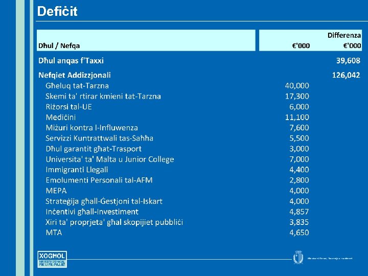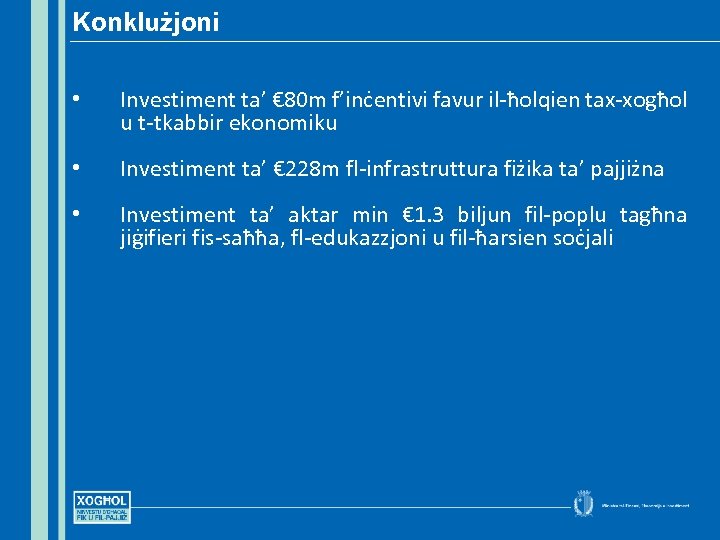 Konklużjoni • Investiment ta’ € 80 m f’inċentivi favur il-ħolqien tax-xogħol u t-tkabbir ekonomiku • Investiment ta’ € 228 m fl-infrastruttura fiżika ta’ pajjiżna • Investiment ta’ aktar min € 1. 3 biljun fil-poplu tagħna jiġifieri fis-saħħa, fl-edukazzjoni u fil-ħarsien soċjali