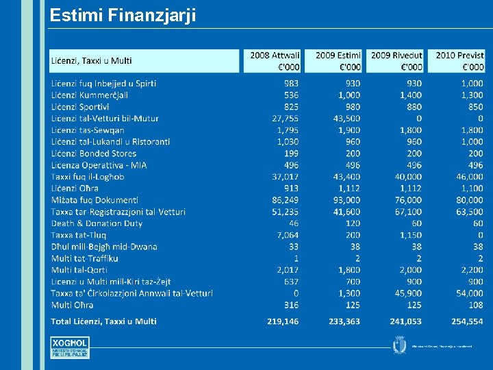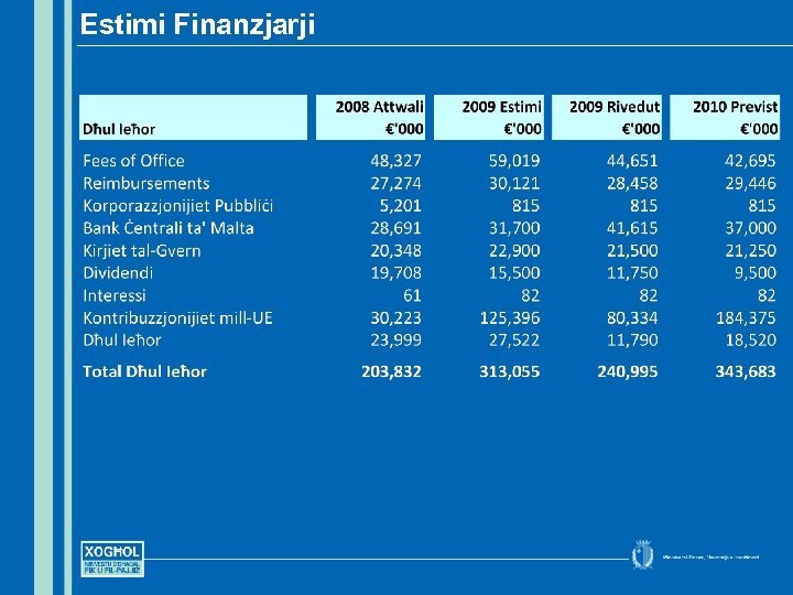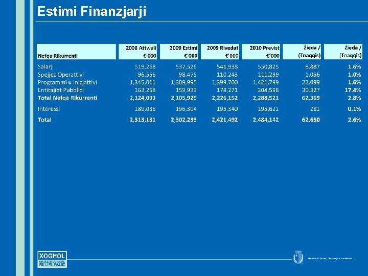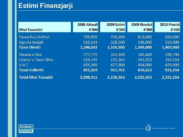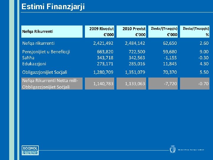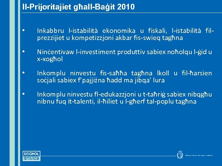 Il-Prijoritajiet għall-Baġit 2010 • Inkabbru l-istabilità ekonomika u fiskali, l-istabilità filprezzijiet u kompetizzjoni akbar fis-swieq tagħna • Ninċentivaw l-investiment produttiv sabiex noħolqu l-ġid u x-xogħol • Inkomplu ninvestu fis-saħħa tagħna lkoll u fil-ħarsien soċjali sabiex f’pajjiżna ħadd ma jibqa’ lura • Inkomplu ninvestu fl-edukazzjoni u t-taħriġ sabiex nibqgħu nibnu fuq it-talenti, il-ħiliet u l-għerf tal-poplu tagħna