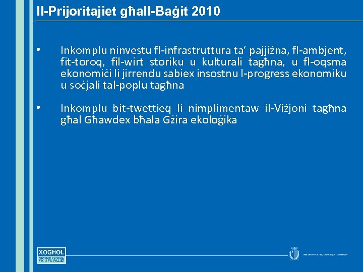 Il-Prijoritajiet għall-Baġit 2010 • Inkomplu ninvestu fl-infrastruttura ta’ pajjiżna, fl-ambjent, fit-toroq, fil-wirt storiku u kulturali tagħna, u fl-oqsma ekonomiċi li jirrendu sabiex insostnu l-progress ekonomiku u soċjali tal-poplu tagħna • Inkomplu bit-twettieq li nimplimentaw il-Viżjoni tagħna għal Għawdex bħala Gżira ekoloġika