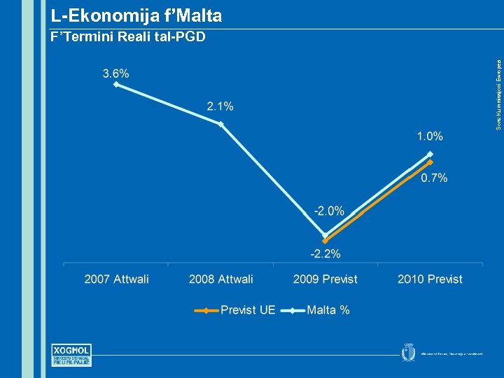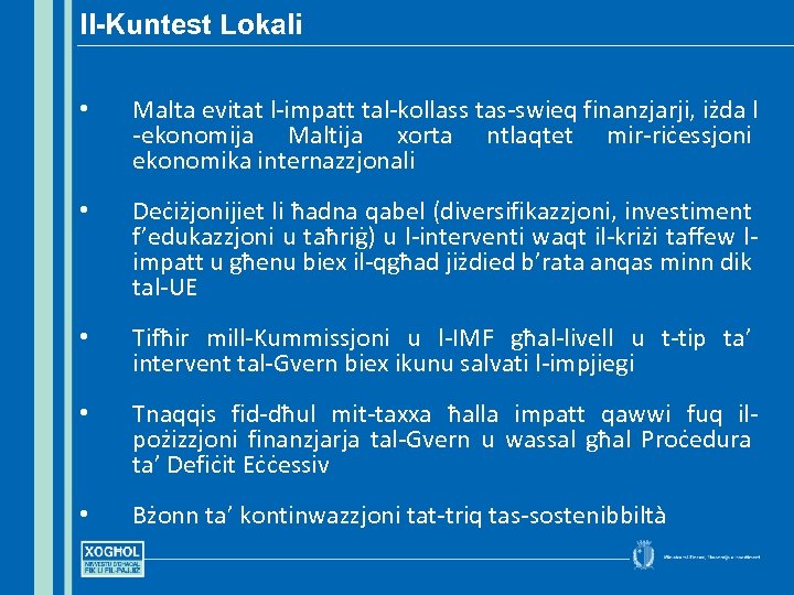Il-Kuntest Lokali • Malta evitat l-impatt tal-kollass tas-swieq finanzjarji, iżda l -ekonomija Maltija xorta ntlaqtet mir-riċessjoni ekonomika internazzjonali • Deċiżjonijiet li ħadna qabel (diversifikazzjoni, investiment f’edukazzjoni u taħriġ) u l-interventi waqt il-kriżi taffew limpatt u għenu biex il-qgħad jiżdied b’rata anqas minn dik tal-UE • Tifħir mill-Kummissjoni u l-IMF għal-livell u t-tip ta’ intervent tal-Gvern biex ikunu salvati l-impjiegi • Tnaqqis fid-dħul mit-taxxa ħalla impatt qawwi fuq ilpożizzjoni finanzjarja tal-Gvern u wassal għal Proċedura ta’ Defiċit Eċċessiv • Bżonn ta’ kontinwazzjoni tat-triq tas-sostenibbiltà