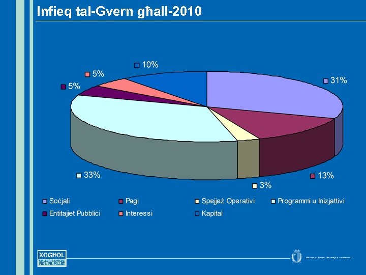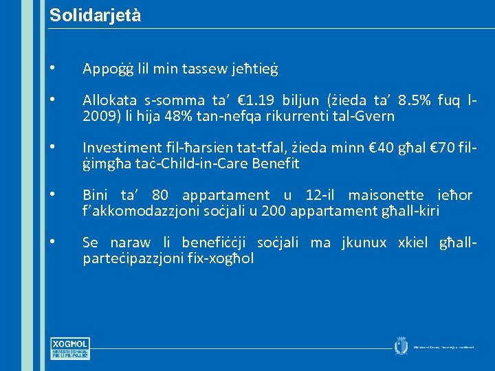 Solidarjetà • Appoġġ lil min tassew jeħtieġ • Allokata s-somma ta’ € 1. 19 biljun (żieda ta’ 8. 5% fuq l 2009) li hija 48% tan-nefqa rikurrenti tal-Gvern • Investiment fil-ħarsien tat-tfal, żieda minn € 40 għal € 70 filġimgħa taċ-Child-in-Care Benefit • Bini ta’ 80 appartament u 12 -il maisonette ieħor f’akkomodazzjoni soċjali u 200 appartament għall-kiri • Se naraw li benefiċċji soċjali ma jkunux xkiel għallparteċipazzjoni fix-xogħol