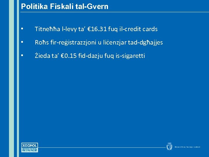 Politika Fiskali tal-Gvern • Titneħħa l-levy ta’ € 16. 31 fuq il-credit cards • Roħs fir-reġistrazzjoni u liċenzjar tad-dgħajjes • Żieda ta’ € 0. 15 fid-dazju fuq is-sigaretti