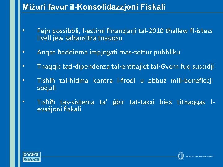 Miżuri favur il-Konsolidazzjoni Fiskali • Fejn possibbli, l-estimi finanzjarji tal-2010 tħallew fl-istess livell jew saħansitra tnaqqsu • Anqas ħaddiema impjegati mas-settur pubbliku • Tnaqqis tad-dipendenza tal-entitajiet tal-Gvern fuq sussidji • Tisħiħ tal-ħidma kontra l-frodi u abbuż mill-benefiċċji soċjali • Tisħiħ tas-sistema ta’ ġbir tat-taxxi biex titnaqqas levażjoni fiskali