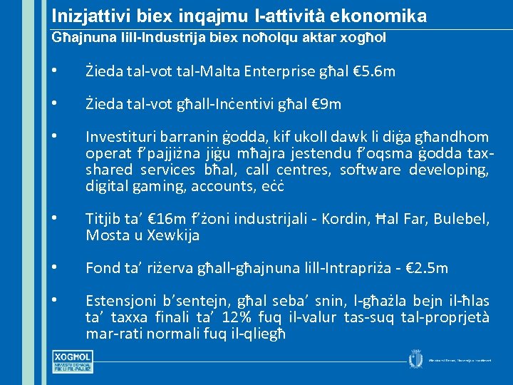 Inizjattivi biex inqajmu l-attività ekonomika Għajnuna lill-Industrija biex noħolqu aktar xogħol • Żieda tal-vot tal-Malta Enterprise għal € 5. 6 m • Żieda tal-vot għall-Inċentivi għal € 9 m • Investituri barranin ġodda, kif ukoll dawk li diġa għandhom operat f’pajjiżna jiġu mħajra jestendu f’oqsma ġodda taxshared services bħal, call centres, software developing, digital gaming, accounts, eċċ • Titjib ta’ € 16 m f’żoni industrijali - Kordin, Ħal Far, Bulebel, Mosta u Xewkija • Fond ta’ riżerva għall-għajnuna lill-Intrapriża - € 2. 5 m • Estensjoni b’sentejn, għal seba’ snin, l-għażla bejn il-ħlas ta’ taxxa finali ta’ 12% fuq il-valur tas-suq tal-proprjetà mar-rati normali fuq il-qliegħ