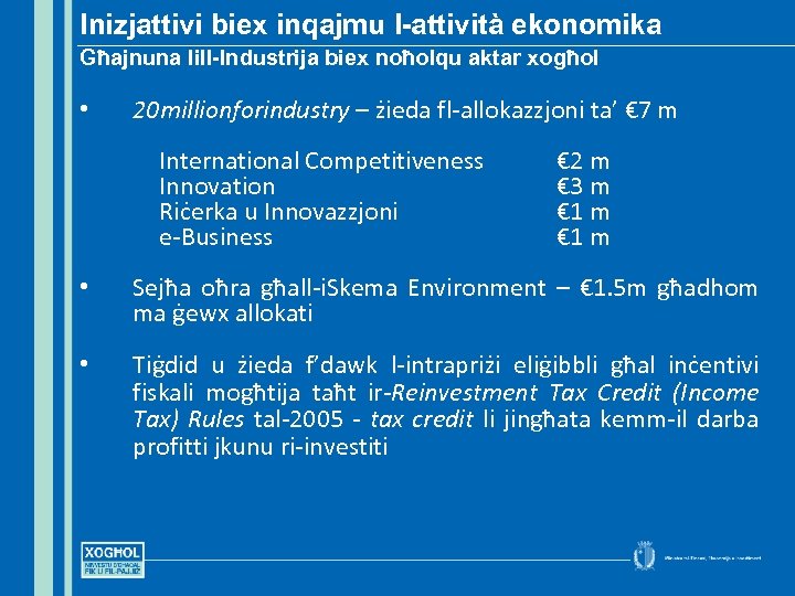 Inizjattivi biex inqajmu l-attività ekonomika Għajnuna lill-Industrija biex noħolqu aktar xogħol • 20 millionforindustry – żieda fl-allokazzjoni ta’ € 7 m International Competitiveness Innovation Riċerka u Innovazzjoni e-Business € 2 m € 3 m € 1 m • Sejħa oħra għall-i. Skema Environment – € 1. 5 m għadhom ma ġewx allokati • Tiġdid u żieda f’dawk l-intrapriżi eliġibbli għal inċentivi fiskali mogħtija taħt ir-Reinvestment Tax Credit (Income Tax) Rules tal-2005 - tax credit li jingħata kemm-il darba profitti jkunu ri-investiti