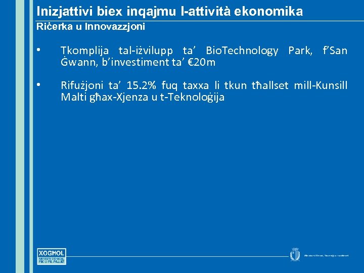 Inizjattivi biex inqajmu l-attività ekonomika Riċerka u Innovazzjoni • Tkomplija tal-iżvilupp ta’ Bio. Technology Park, f’San Ġwann, b’investiment ta’ € 20 m • Rifużjoni ta’ 15. 2% fuq taxxa li tkun tħallset mill-Kunsill Malti għax-Xjenza u t-Teknoloġija